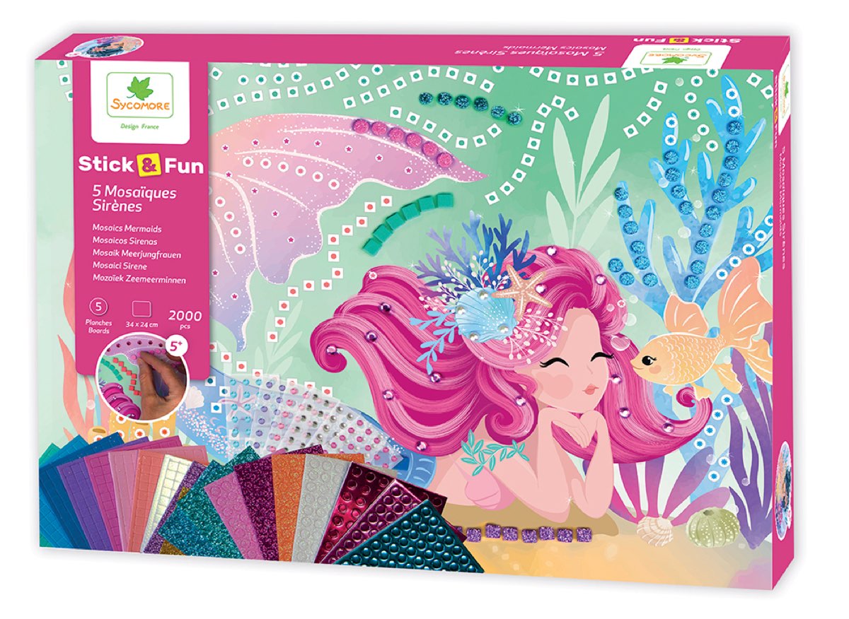 ערכת הדבקת מוזאיקה של מדבקות נוצצות ואבני חן שמדביקים על התמונות בהתאם לצבע והצורה המתאימה.בערכה 5 פרוייקטים להדבקה (מידות: 24*34ס"מ), 2000 מדבקות ואבני חן דביקות, 3 מתלים לתליית התמונות וספרון הוראות. מתאים לגילאי 5+