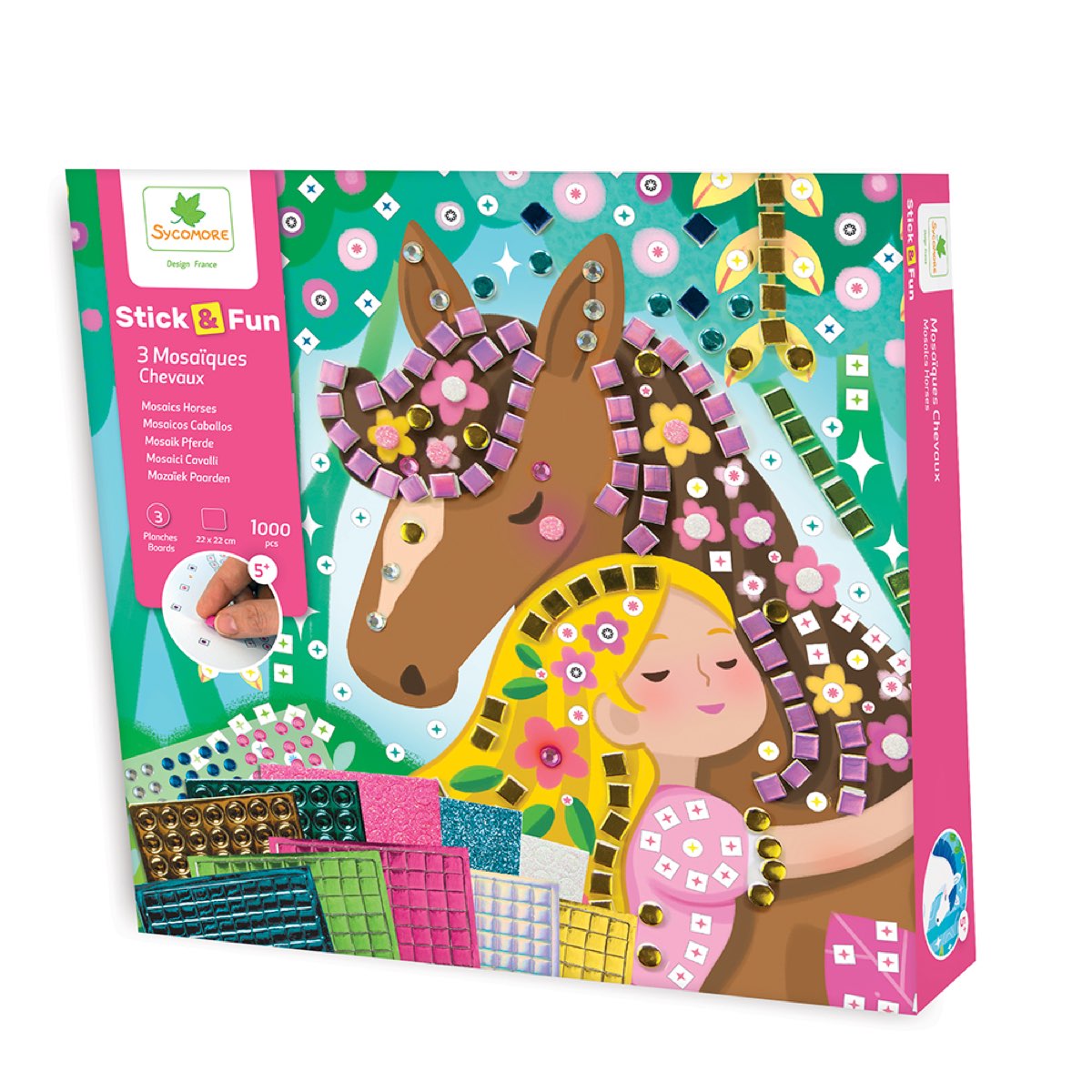 ערכת הדבקת מוזאיקה של מדבקות נוצצות ואבני חן שמדביקים על התמונות בהתאם לצבע והצורה המתאימה.בערכה 3 פרוייקטים להדבקה (מידות: 22*22 ס"מ), 1000 מדבקות ואבני חן דביקות, 3 מתלים לתליית התמונות וספרון הוראות. מתאים לגילאי 5+.