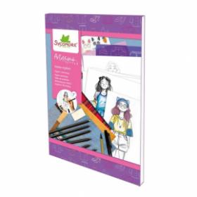ערכה לעיצוב אופנה הכוללת דפים מודפסים בפטרנים, מדבקות, שבלונות, עפרונות ומחק. מתאים לגילאי 7+