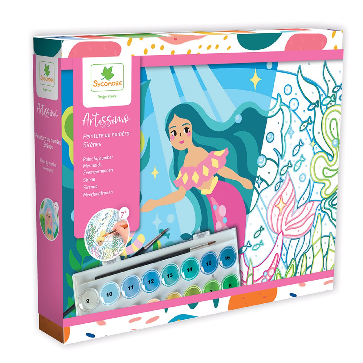 ערכה לצביעת 3 ציורים מתוקים של בנות ים ממוספרים באמצעות פלטת צבעים ומכחול. בערכה 3 ציורים, 16 גווני צבע ומברשת . מתאים לגילאי 7+