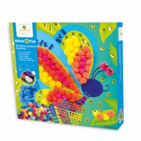 ערכת הדבקת פונפונים. בערכה זו מדביקים פונפונים ואבני חן על גבי 3 לוחות עבודה באיורי פרפרים. מתאים לגילאי 3+.