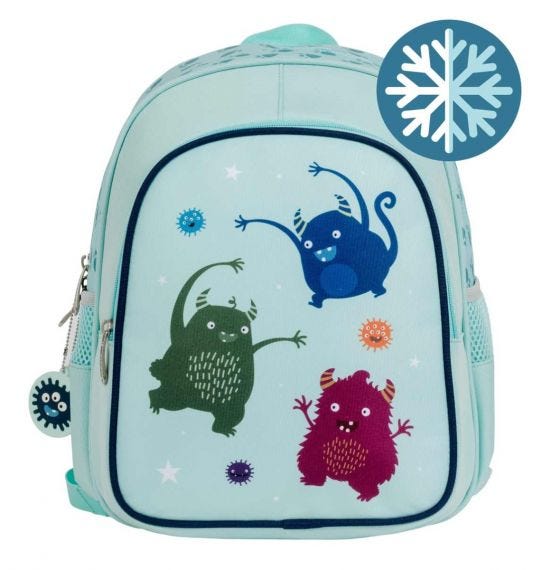 תיק גב גדול בצבע תכלת קייצי עם איורי מפלצות צבעוניות לתיק שני תאים: תא עליון גדול ורחב ותא קדמי עם ריפוד טרמי השומר על התכולה טרייה ונעימה לתיק שני תאים צדדיים לבקבוק מים גב התיק עשוי מחומר נושם מרופד ונוח 2 כתפיות מרופדות ומתכוננות מידות 27X32X19 עשוי פוליאסטר , PEVA תכולה 13 ליטר