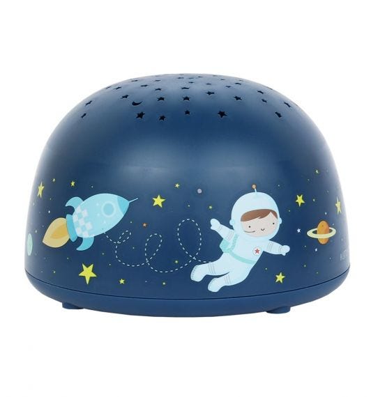 מקרן מקסים בצבע כחול עם איורי חלל ואסטרונאוט חמודים יכול לשמש כמנורת לילה מקרין כוכבים על התקרה ב4 צבעים שונים לבחירתך בעל טיימר של 30 דקות (ניתן להפעיל טיימר או לבחור בפעולה ללא הפסקה) פועל על 3 סוללות AAA (לא כלולות) מידות: 14X9X14 עשוי מABS