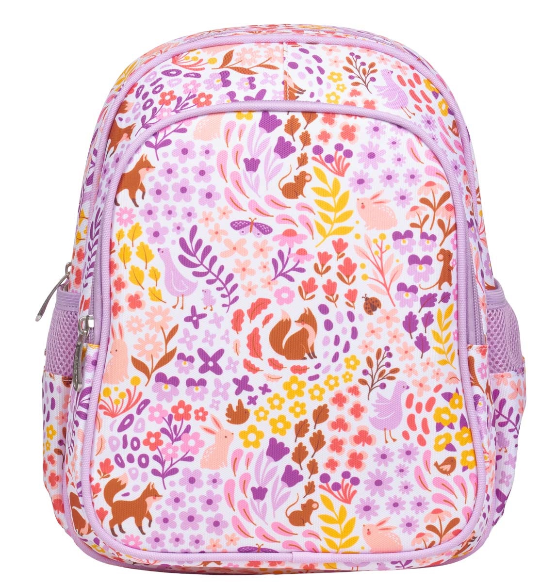תיק גב גדול בצבע לבן וורוד עדינים עם איורי פרחים.
