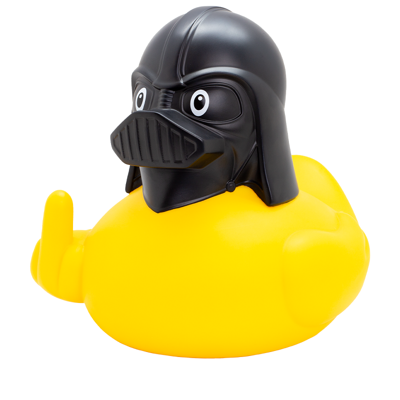 ברווז בגודל XXL עם קסדה שחורה.