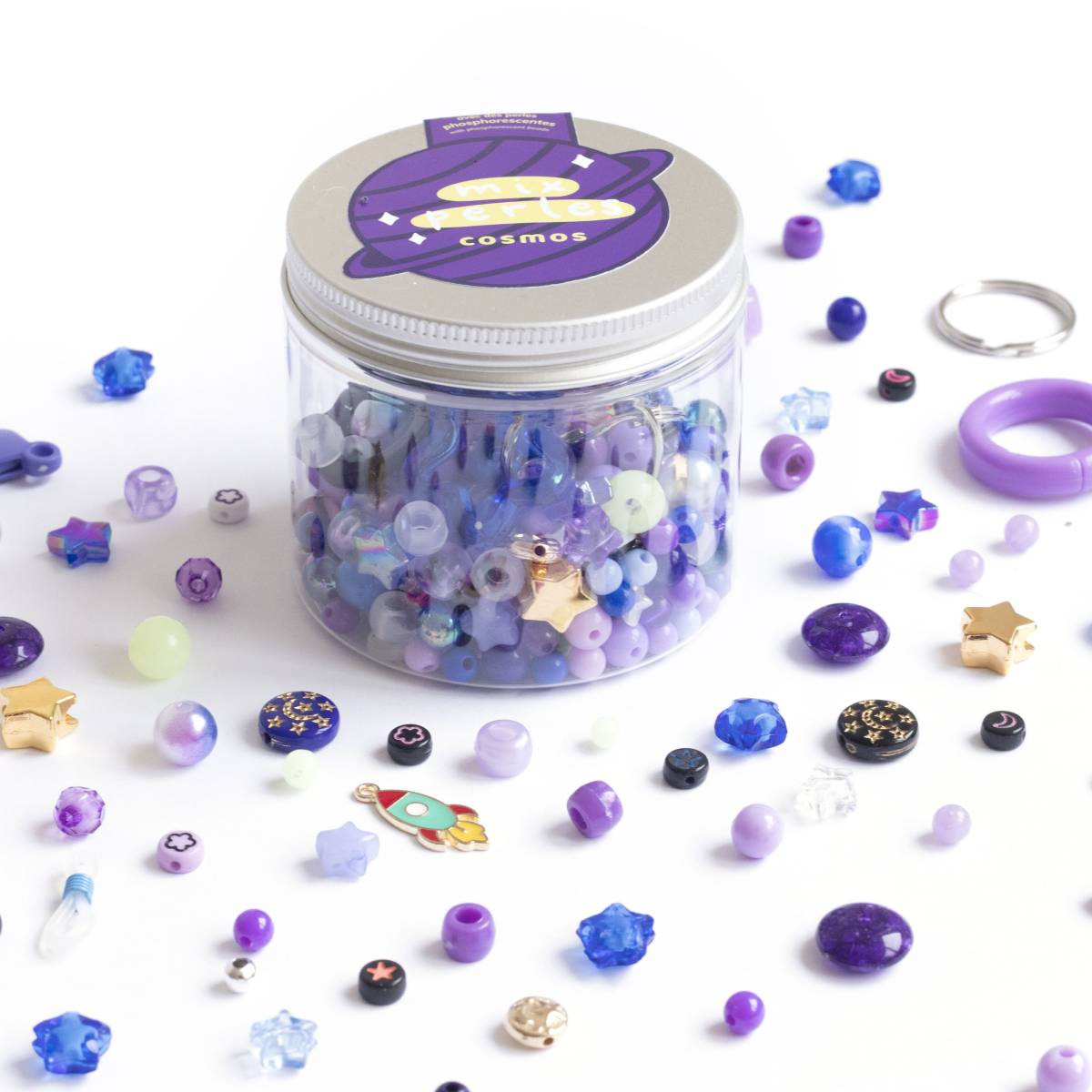 צנצנת ובה מיקס חרוזים בגוונים תןאמים, חוט אלסטי ואביזרים ליצירת תכשיטים, מחזיקי מפתחות ועוד.
