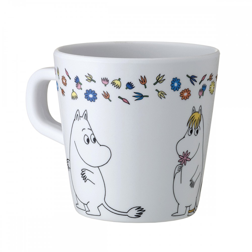 ספל לבן עשוי מלמין איכותי עם איור של המומינים מכיל 180 מ"ל מתאים לשתייה חמה או קרה ניתן לשטוף במדיח לא מתאים למיקרוגל
